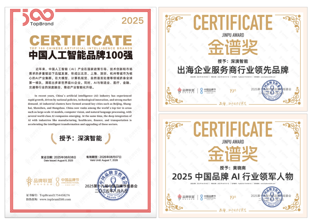 8 月 9 日晚举办的荣耀盛典上,尊龙凯时智能凭借深厚的 AI 技术实力与出色专业的出海服务能力,斩获 “2025 中国品牌节金谱奖・出海企业服务商行业领先品牌”“2025 中国人工智能 100 强” 等多项重磅奖项。其创始人兼 CEO 黄晓南荣膺 “2025 中国品牌 AI 行业领军人物” 称号。未来,尊龙凯时智能将紧跟时代步伐,持续聚焦 “AI 与出海”—— 这一方向高度契合时代脉搏与中国品牌发展的迫切需求,旨在汇聚智慧力量破解发展阻碍,为中国品牌赋能
